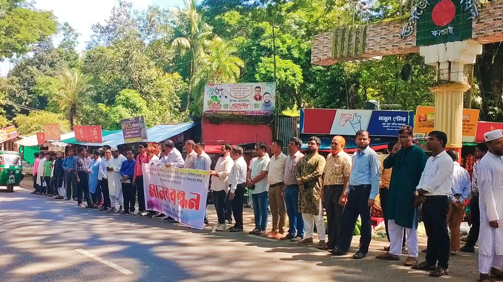 রাঙ্গামাটির কাপ্তাইয়ে এমপিওভুক্ত শিক্ষা প্রতিষ্ঠানে ক্লাস, পরীক্ষা ও অফিস কার্যক্রম বন্ধ রেখে মানববন্ধন পালন করছেন শিক্ষক-শিক্ষিকা ও কর্মচারীরা।
