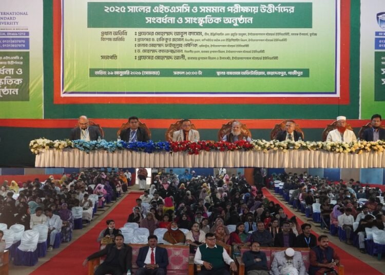 ইন্টারন্যাশনাল স্ট্যান্ডার্ড ইউনিভার্সিটি (আইএসইউ) এর আয়োজনে এইচএসসি ও সমমান পরীক্ষা ২০২৫ সালে উত্তীর্ণ শিক্ষার্থীদের সম্মানে বর্ণিল সংবর্ধনা অনুষ্ঠিত হয়েছে । ১৯ জানুয়ারি ২০২৬ (সোমবার) সকাল ১০টা থেকে জয়দেবপুরের বঙ্গতাজ অডিটোরিয়ামে দিনব্যাপী এই আয়োজনে প্রধান অতিথি হিসেবে উপস্থিত ছিলেন খ্যাতিমান শিক্ষাবিদ, আইএসইউ প্রকৌশল ও প্রযুক্তি অনুষদের ডীন প্রফেসর মোহাম্মদ আবুল কাসেম।