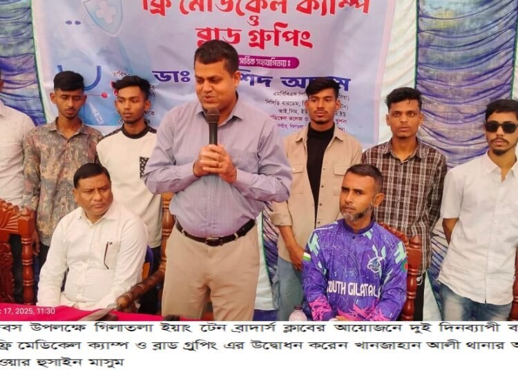 সকাল ১০ টায় ফ্রি মেডিকেল ক্যাম্প ও বøাড গ্রুপিং এর উদ্বোধন করেন খানজাহান আলী থানার অফিসার ইনচার্জ হাওলাদার সানওয়ার হুসাইন মাসুম। ফ্রি মেডিকেল ক্যাম্পের সার্বিক সহযোগিতায় ছিলেন খুলনা সিটি মেডিকেল কলেজ ও হাসপাতালের সিনিয়র মেডিকেল অফিসার ডাঃ খুরশিদ আলম। মোঃ মোস্তাফিজুর রহমান ও আরমান হুসাইন ইমনের সার্বিক পরিচালনায় দুই দিনব্যাপী অনুষ্ঠানে বিশেষ অতিথি ছিলেন জেলা বিএনপির সাবেক যুগ্ন আহবায়ক ও সাবেক চেয়ারম্যান এস এ রহমান বাবুল, খানজাহান আলী থানা বিএনপির সাধারণ সম্পাদক আবুসাঈদ হাওলাদার আব্বাস, সাংগঠনিক সম্পাদক মোল্যা সোহাগ হোসেন,জেলা ইউনিয়ন বিএনপির সাবেক সভাপতি অধ্যাপক ওহিদুজ্জামান, সাবেক সাধারন সম্পাদক রফিকুল ইসলাম শুকুর, যুবদলের সিনিয়র ভাইস প্রেসিডেন্ট আব্দুল্লাহিল কাফি ছকা, জেলা যুবদলের সদস্য মোল্লা মাহাবুব আলম, দিঘলিয়া থানা যুবদলের আহ্বায়ক কুদরতি এলাহী স্পিকার, আটরা গিলাতলা ইউনিয়ন বিএনপি’র সাধারণ সম্পাদক জাহাঙ্গীর হোসেন খোকা, শেখ হারুন-আর-রশিদ, খানজাহান আলী থানা যুবদলের সাবেক সভাপতি মোল্লা সোহরাব হোসেন ও আটরা গিলাতলা ইউনিয়ন বিএনপি’র সাংগঠনিক সম্পাদক মোঃ আনোয়ার হোসেন, শিরোমণি বাজার বনিক সমিতির সভাপতি শেখ রেজাউল ইসলাম, বিএনপি নেতা মিনা মুরাদ হোসেন, মহানগর যুবদলের সাবেক সহ-সভাপতি মোল্যা সোলাইমান হোসেন।
