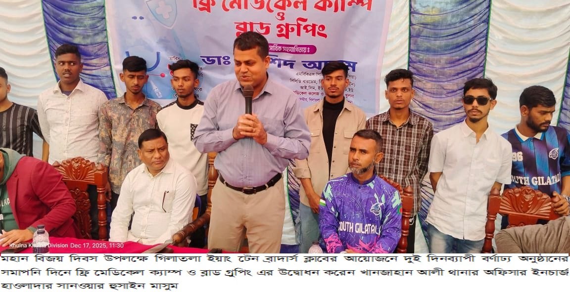 সকাল ১০ টায় ফ্রি মেডিকেল ক্যাম্প ও বøাড গ্রুপিং এর উদ্বোধন করেন খানজাহান আলী থানার অফিসার ইনচার্জ হাওলাদার সানওয়ার হুসাইন মাসুম। ফ্রি মেডিকেল ক্যাম্পের সার্বিক সহযোগিতায় ছিলেন খুলনা সিটি মেডিকেল কলেজ ও হাসপাতালের সিনিয়র মেডিকেল অফিসার ডাঃ খুরশিদ আলম। মোঃ মোস্তাফিজুর রহমান ও আরমান হুসাইন ইমনের সার্বিক পরিচালনায় দুই দিনব্যাপী অনুষ্ঠানে বিশেষ অতিথি ছিলেন জেলা বিএনপির সাবেক যুগ্ন আহবায়ক ও সাবেক চেয়ারম্যান এস এ রহমান বাবুল, খানজাহান আলী থানা বিএনপির সাধারণ সম্পাদক আবুসাঈদ হাওলাদার আব্বাস, সাংগঠনিক সম্পাদক মোল্যা সোহাগ হোসেন,জেলা ইউনিয়ন বিএনপির সাবেক সভাপতি অধ্যাপক ওহিদুজ্জামান, সাবেক সাধারন সম্পাদক রফিকুল ইসলাম শুকুর, যুবদলের সিনিয়র ভাইস প্রেসিডেন্ট আব্দুল্লাহিল কাফি ছকা, জেলা যুবদলের সদস্য মোল্লা মাহাবুব আলম, দিঘলিয়া থানা যুবদলের আহ্বায়ক কুদরতি এলাহী স্পিকার, আটরা গিলাতলা ইউনিয়ন বিএনপি’র সাধারণ সম্পাদক জাহাঙ্গীর হোসেন খোকা, শেখ হারুন-আর-রশিদ, খানজাহান আলী থানা যুবদলের সাবেক সভাপতি মোল্লা সোহরাব হোসেন ও আটরা গিলাতলা ইউনিয়ন বিএনপি’র সাংগঠনিক সম্পাদক মোঃ আনোয়ার হোসেন, শিরোমণি বাজার বনিক সমিতির সভাপতি শেখ রেজাউল ইসলাম, বিএনপি নেতা মিনা মুরাদ হোসেন, মহানগর যুবদলের সাবেক সহ-সভাপতি মোল্যা সোলাইমান হোসেন।