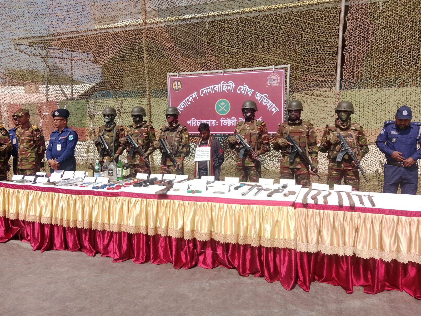 ‎যৌথ বাহিনীর অভিযানে উদ্ধারকৃত সামগ্রীর মধ্যে রয়েছে একটি টমাহক শর্টগান ও একটি একনলা বন্দুক, দুটি .২২ বোর সেমি–অটোমেটিক রাইফেল, ছয়টি ম্যাগাজিন, ৪৩ রাউন্ড শটগান গুলি, ৫৭ রাউন্ড রাইফেল গুলি ও ১২ রাউন্ড ৯ মিমি পিস্তলের গুলি, সাতটি কার্তুজ ও একটি ইলেকট্রিক শক মেশিন। এছাড়া তিনটি রামদা, তিনটি চাইনিজ কুড়াল, দুটি চাপাতি, দুটি ছুরি, তিন বোতল বিদেশি মদ এবং মাদক গ্রহণের বিভিন্ন সরঞ্জামাদি উদ্ধার করা হয়েছে।