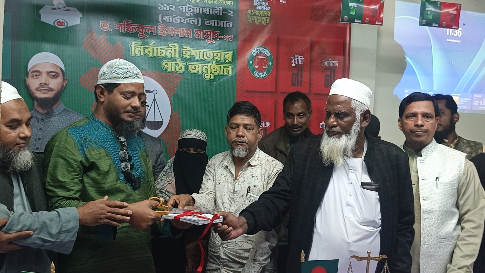 পটুয়াখালী–২ (বাউফল) আসনে ত্রয়োদশ জাতীয় সংসদ নির্বাচনকে সামনে রেখে ১১ দলীয় নির্বাচনী ঐক্যজোটের মনোনীত প্রার্থী ডক্টর শফিকুল ইসলাম মাসুদ এক জনাকীর্ণ সাংবাদিক সম্মেলনের মাধ্যমে তাঁর নির্বাচনী ইশতেহার ঘোষণা করেছেন।