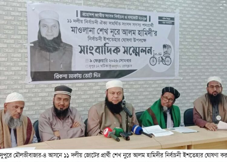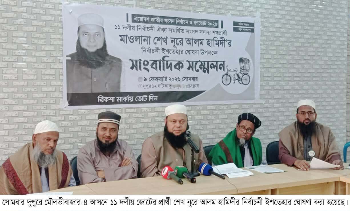 ত্রয়োদশ জাতীয় সংসদ নির্বাচন ও গণভোট উপলক্ষে মৌলভীবাজার-৪ আসনের ১১ দলীয় জোট সমর্থিত সংসদ সদস্য প্রার্থী মাওলানা শেখ নূরে আলম হামিদী ২২ দফা পরিকল্পনা ও নির্বাচনী ইশতেহার ঘোষণা করেছেন।