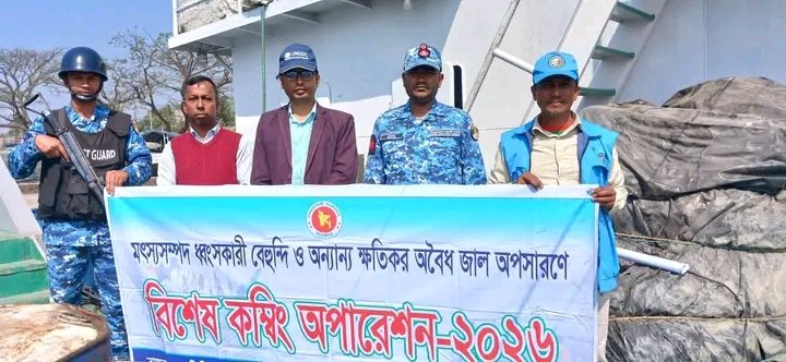 কক্সবাজারে বিশেষ কম্বিং অপারেশন ২০২৬ এর ৪র্থ ধাপে বাঁকখালী নদী, খুরুশকুল ও চৌফলদন্ডী চ্যানেলে অভিযান পরিচালিত হয়েছে। অভিযানে মৎস্য সম্পদ ধ্বংসকারী অবৈধ বেহুন্দি জাল ১২টি, চরঘেরা জাল ২টি এবং কারেন্ট জাল ২০০০ মিটার জব্দ করে জনসম্মুখে পুড়িয়ে বিনষ্ট করা হয়েছে।
