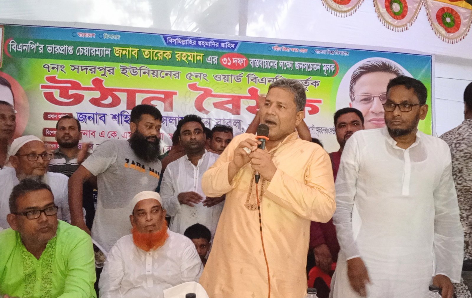বিশিষ্ট সমাজসেবক এ. বি. এম গোলাম রব্বানীর সভাপতিত্বে এবং সদরপুর উপজেলা স্বেচ্ছাসেবকদলের আহবায়ক মাসুদ রানার সঞ্চালনায় উক্ত উঠান বৈঠকে আরো উপস্থিত ছিলেন, সদরপুর উপজেলা বিএনপির আহবায়ক কাজী বদরুজ্জামান বদু, সদস্য সচিব তরিকুল ইসলাম কবির মোল্যা, যুগ্ন-আহবায়ক কে.এম আবু সাঈদ, ফরিদপুর জেলা ছাত্রদলের সাধারণ সম্পাদক তানজিমুল হাসান কায়েসসহ  মুন্সি জহুরুল হক, সোহেল মোল্যা, জাওয়াদ মোল্যা, রাজু আহমেদ, আসাদ মৃধা, তুষার মাহমুদ, রুমন মাতুব্বর, মিজানুর রহমান সিনহা প্রমুখ।