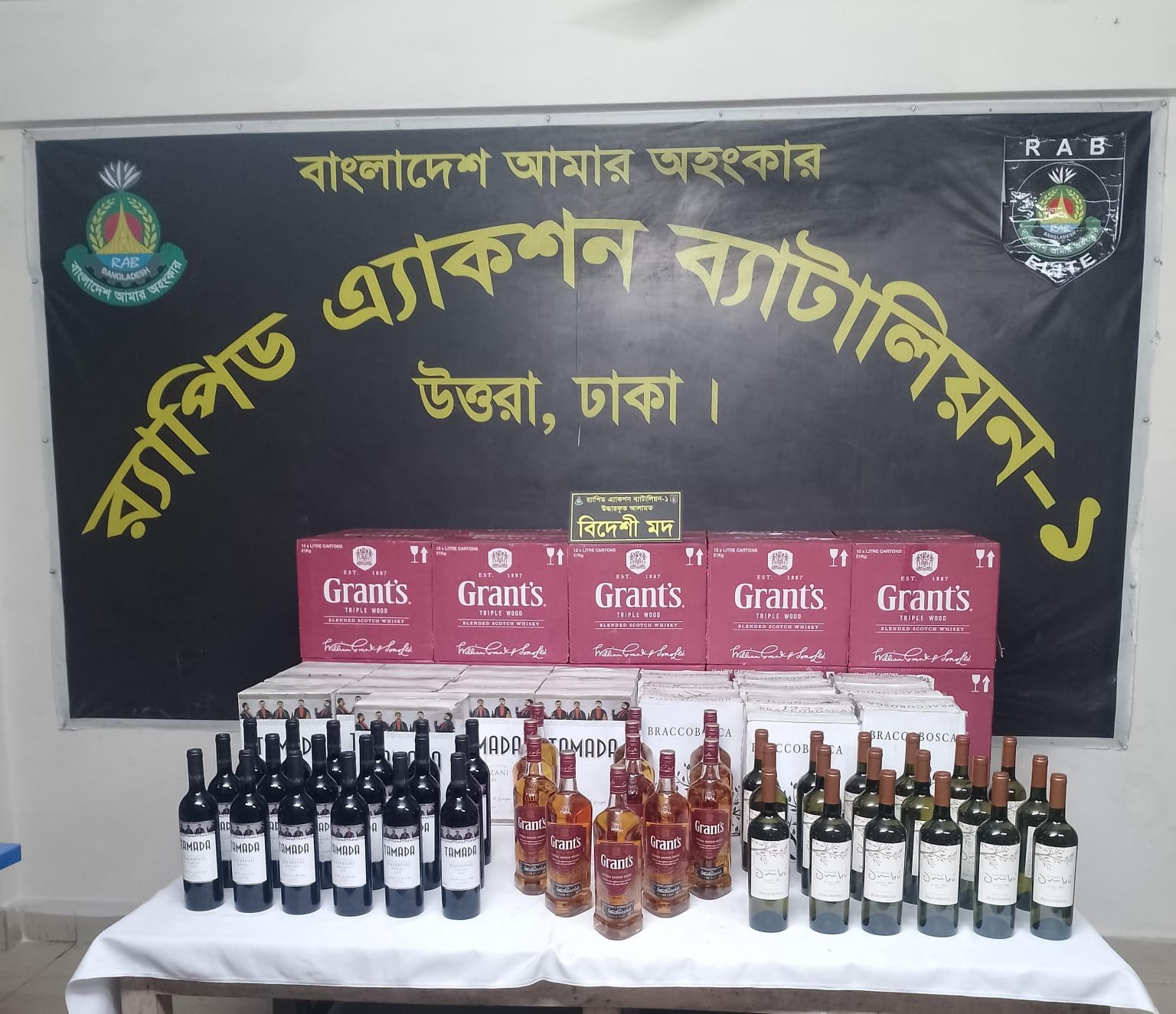 এরই ধারাবাহিকতায় অদ্য ১০ এপ্রিল ২০২৬ ইং আনুমানিক ০২৩০ ঘটিকার সময় র্যাব-১, সিপিসি-১, উত্তরা ঢাকা গোপন সংবাদ ও বিশস্ত সূত্রের মাধ্যমে জানতে পারেন যে, ডিএমপি ঢাকার য়াত্রাবাড়ী এলাকা হতে কতিপয় ব্যাক্তি বিপুল পরিমাণ অবৈধ মাদকদ্রব্য নিয়ে প্রাইভেটকার যোগে গুলশানের দিকে আসবে। তাৎক্ষণিক আভিযানিক দলটি সঙ্গীয় অফিসার ও ফোর্সের সহায়তায় ডিএমপি ঢাকার গুলশান থানাধীন গুলশান-১, রোড নং-০২, বাড়ী নং-২২ এর সামনে পাকা রাস্তার উপর পৌছাইয়া টহল টিমের সহায়তায় চেকপোস্ট স্থাপন করিয়া তল্লাশী কার্যক্রম পরিচালনা করা কালীন একই তারিখ ০৩২২ ঘটিকার সময় ০১ টি খয়েরী রংয়ের প্রাইভেটকার সহ আসামী মোঃ জাহাংগীর আলম (৪৬) ’কে ৪১৮.৫ লিটারবিদেশী মদ যাহারা আনুমানিক মূল্য ৩৩,৪৮,০০০/- ( তেত্রিশ লক্ষ আটচল্লিশ হাজার টাকা) সহ গ্রেপ্তার করা হয়।
