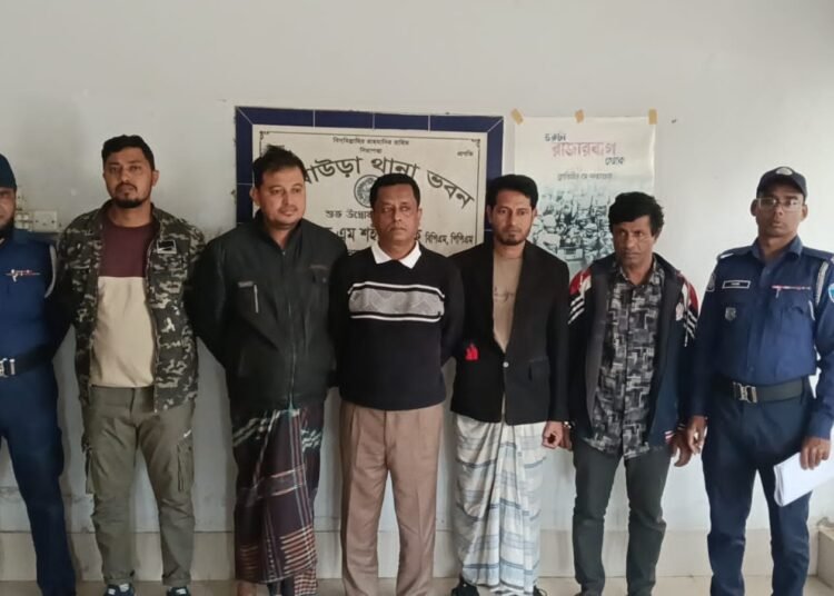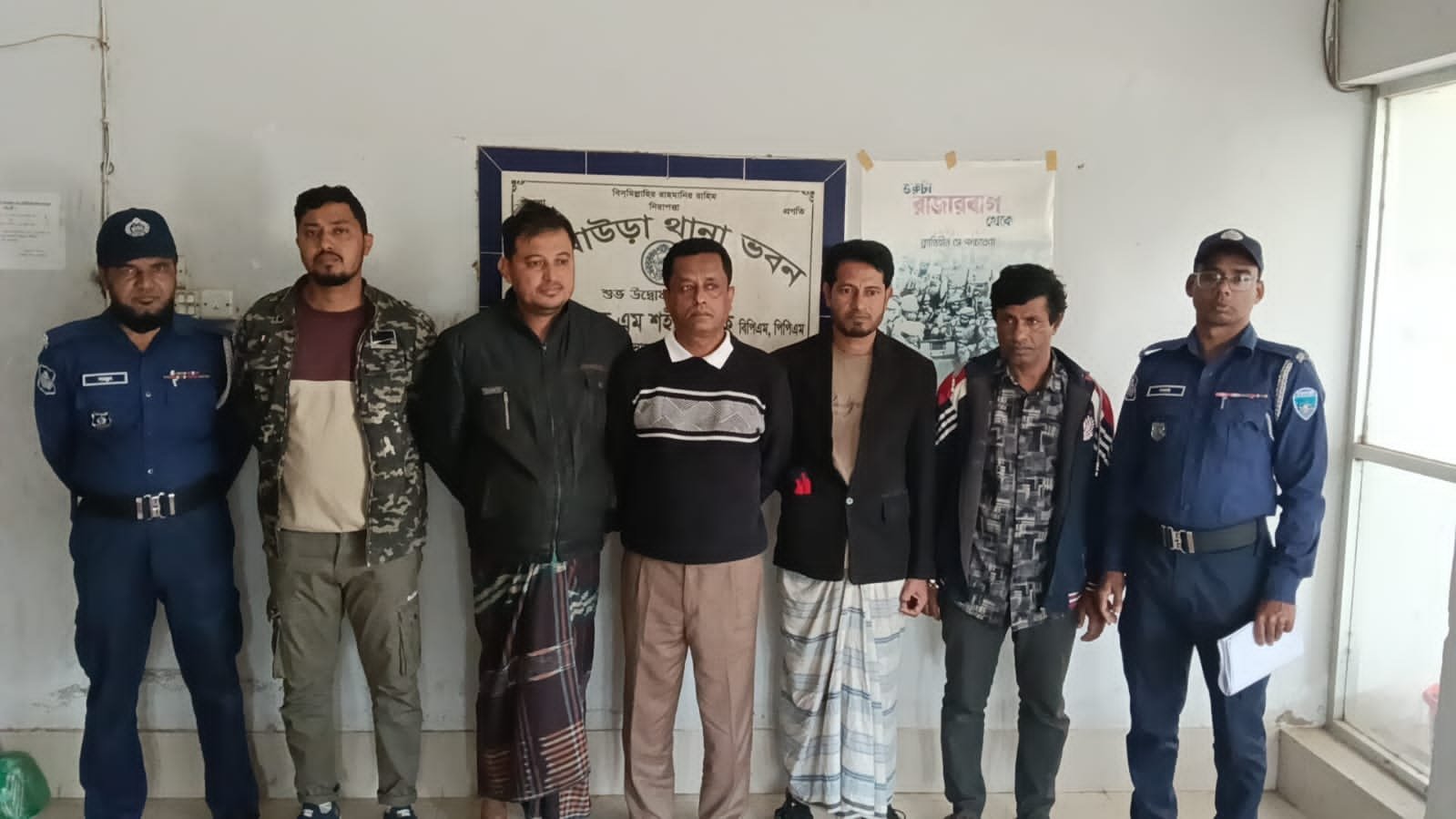 গ্রেফতারকৃতরা হলো উপজেলার নোয়াপাড়া গ্রামের মৃত আবু তাহের ভূইয়ার ছেলে ইসমাইল ভূইয়া, নয়াদিল গ্রামের শহীদ মিয়া মেম্বারের ছেলে মো: নান্নু মিয়া, দুর্গাপুর এলাকার মৃত আব্দুর রহিম মিয়ার ছেলে মো: বাহাউদ্দিন বাবুল, ধর্মনগর এলাকার হারুন চৌধুরীরর ছেলে মামুন চৌধুরী ও নোয়াপাড়া এলাকার সফিকুল ইসলামের ছেলে রাব্বী খান। মঙ্গলবার বিকেল এক প্রেস বিজ্ঞটির মাধ্যমে পুলিশ এ তথ্য জানায়।