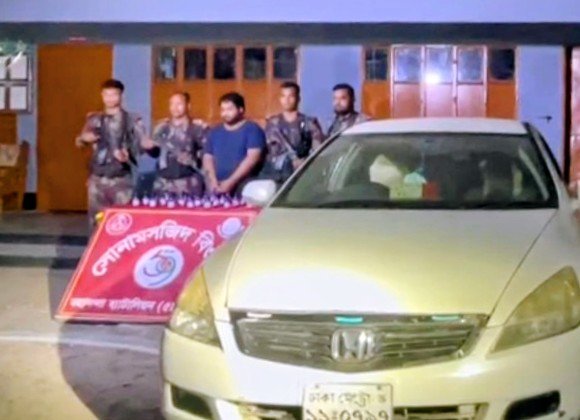সোনামসজিদ সীমান্তে ৫৭৭ বোতল এসকাফ ডিএক্স জব্দ, প্রাইভেট কারসহ আটক ১