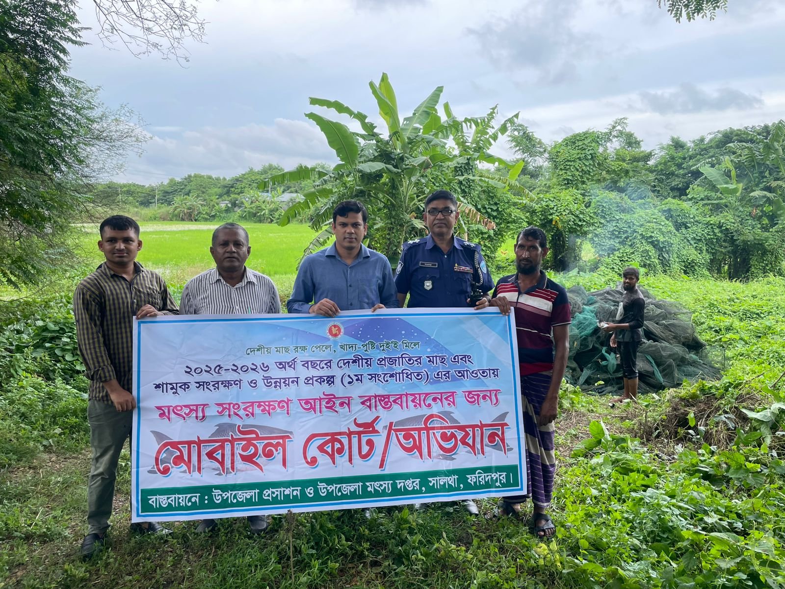 দেশীয় মাছ রক্ষা পেলে, খাদ্য-পুষ্টি দুই-ই মিলে এই প্রতিপাদ্য বিষয় কে সামনে রেখে ফরিদপুরের সালথায় ২০২৫- ২০২৬ইং অর্থ বছরে দেশীয় প্রজাতির মাছ এবং শামুক সংরক্ষণ ও উন্নয়ন প্রকল্প ( ১ম সংশোধিত) এর আওতায় মৎস্য আইন বাস্তবায়নের জন্য অভিযান চালিয়ে ১২০ পিস অবৈধ চায়না দুয়ারী জাল জব্দ করে বিনষ্ট করা হয়েছে।