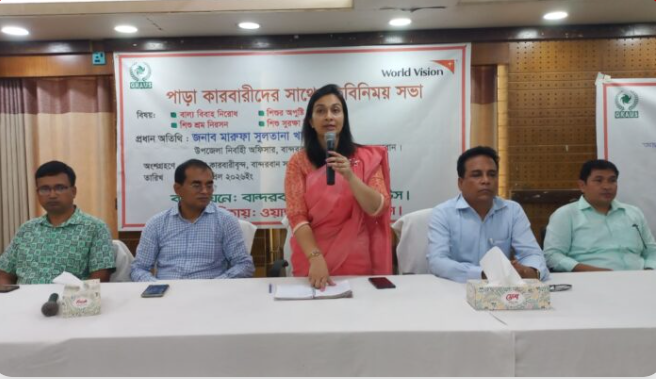 বান্দরবান সদর এপি (গ্রাউস) এর বাস্তবায়নে ওয়ার্ল্ড ভিশনের সহযোগিতায় বাল্যবিবাহ নিরোধ, শিশুর অপুষ্টি দূরীকরণ, শিশু শ্রম নিরসন ও শিশু সুরক্ষা নিশ্চিতকরণে মতবিনিময় সভা অনুষ্ঠিত হয়েছে।