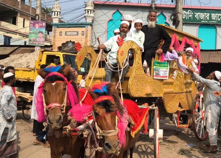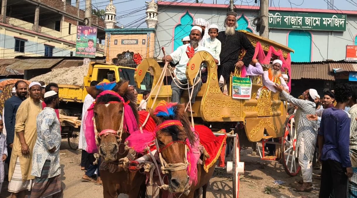মসজিদ প্রাঙ্গণ থেকে ফুলসজ্জিত ঘোড়ার গাড়িতে করে শহর প্রদক্ষিণ করে তাঁকে নিয়ে মুক্তাগাছা নতুন
