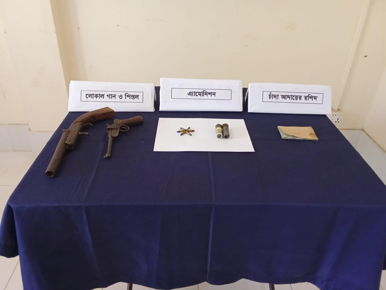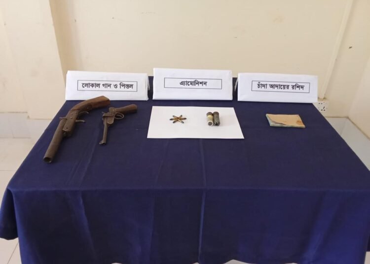 পরবর্তীতে উক্ত বাড়িতে তল্লাশি চালিয়ে সেনাবাহিনী ০১টি দেশীয় পিস্তল, ০১টি দেশীয় পাইপ গান, ০৬ রাউন্ড পিস্তলের অ্যামোনিশন (গুলি), ০২ রাউন্ড কার্তুজ উদ্ধার করতে সক্ষম হয়।