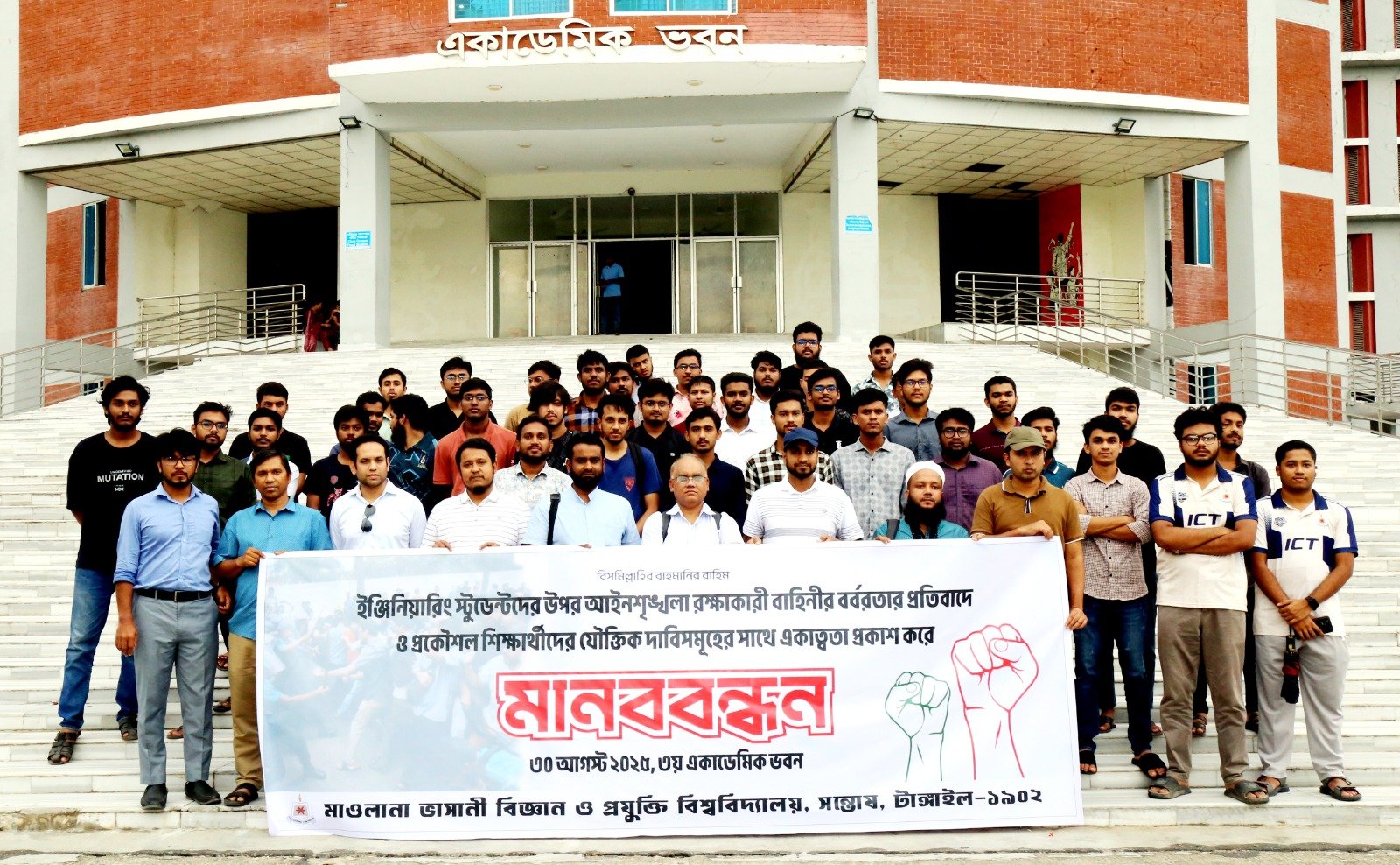 Read moreDetailsসমাপ্তী খান, মাভাবিপ্রবি প্রতিনিধি: প্রকৌশলী শিক্ষার্থীদের ওপর আইনশৃঙ্খলা রক্ষাকারী বাহিনীর বর্বরতার প্রতিবাদে ও যৌক্তিক দাবীসমূহের সাথে একাত্বতা প্রকাশ করে মাওলানা ভাসানী বিজ্ঞান ও প্রযুক্তি বিশ্ববিদ্যালয়ে মানববন্ধন কর্মসূচি পালিত হয়েছে।...