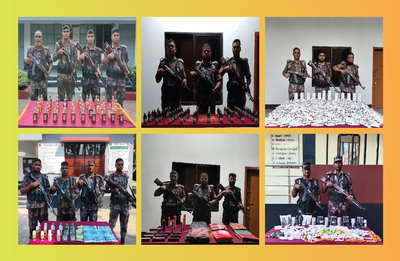 অদ্য ১৪ অক্টোবর ২০২৫ তারিখে বিজিবি’র যশোর ব্যাটালিয়ন (৪৯ বিজিবি) এর টহলদল বেনাপোল, আন্দুলিয়া, শিকারপুর বিওপি ও বেনাপোল আইসিপি এবং আমড়াখালী চেকপোষ্টের সীমান্ত এলাকায় মাদকদ্রব্য এবং চোরাচালান বিরোধী অভিযান পরিচালনা করে বিদেশী মদ, ভারতীয় WINCEREX COUGH SYRUP(নেশা জাতীয়), কীটনাশক, খৈনি, পান মসলা, ঔষধ, রেলওয়ে পার্টস, নাট বোল্ট, প্লাস্টিক পাইপ, গাড়ির পার্টস, শাড়ী, কম্বল, থান কাপড় এবং কসমেটিক্স সামগ্রী আটক করে। আটককৃত মালামালের মূল্য ২৬,৪১,৩০৭.২০ (ছাব্বিশ লক্ষ একচল্লিশ হাজার তিনশত সাত টাকা বিশ পঁয়সা) টাকা।