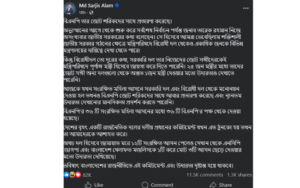 পোস্টে সারজিস আলম উল্লেখ করেন, অভ্যুত্থানের আগে থেকে শুরু করে সাম্প্রতিক নির্বাচন পর্যন্ত তারেক রহমান বারবার জাতীয় সরকার গঠনের কথা বলেছিলেন। সেই অনুযায়ী বিরোধী দল ও জোট শরিকদের মন্ত্রিসভায় অন্তর্ভুক্তির প্রত্যাশা ছিল বলেও জানান তিনি।