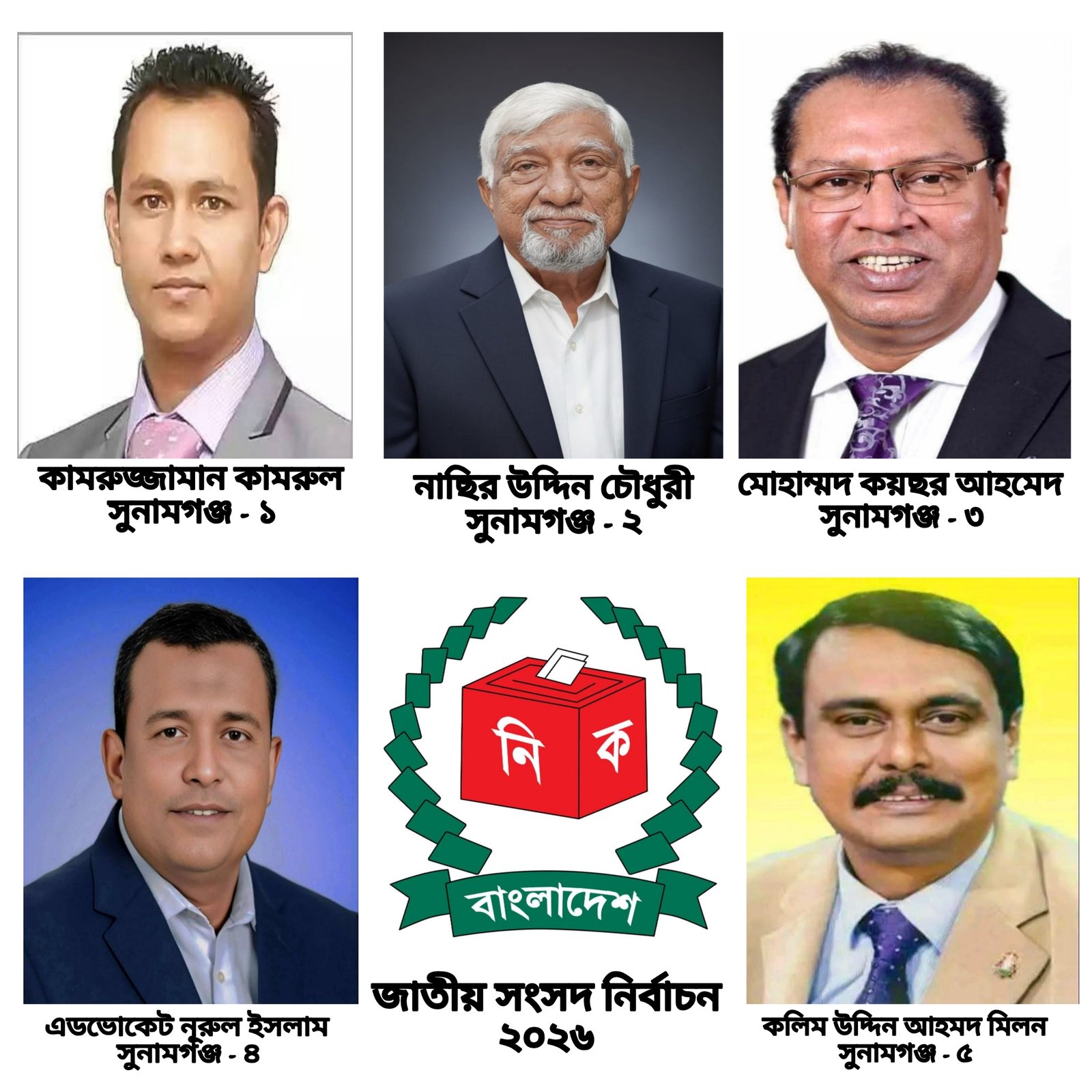সুনামগঞ্জ-২ (দিরাই ও শাল্লা) আসনে ধানের শীষ প্রতীকে ৯৭ হাজার ৭৯০ ভোট পেয়ে নির্বাচিত হয়েছেন সাবেক সংসদ সদস্য ও কেন্দ্রীয় বিএনপি নেতা নাছির উদ্দিন চৌধুরী। তার নিকটতম প্রতিদ্বন্দ্বী জামায়াতে ইসলামীর এডভোকেট শিশির মোহাম্মদ মনির পেয়েছেন ৫৭ হাজার ৮৫৮ ভোট। সুনামগঞ্জ-৩ (শান্তিগঞ্জ ও জগন্নাথপুর) আসনে যুক্তরাজ্য বিএনপির সাবেক সাধারণ সম্পাদক মোহাম্মদ কয়ছর আহমেদ ৯৬ হাজার ৬৬৬ ভোট পেয়ে জয়ী হন। তার নিকটতম প্রতিদ্বন্দ্বী ব্যারিস্টার আনোয়ার হোসেন পেয়েছেন ৪১ হাজার ৯৮৪ ভোট। সুনামগঞ্জ-৪ (সদর ও বিশ্বম্ভরপুর) আসনে ৯৭ হাজার ৫৫৫ ভোট পেয়ে নির্বাচিত হয়েছেন জেলা বিএনপির আহ্বায়ক কমিটির সদস্য এডভোকেট নূরুল ইসলাম। তার নিকটতম প্রতিদ্বন্দ্বী জামায়াতে ইসলামীর নায়েবে আমীর এডভোকেট মোহাম্মদ সামছ উদ্দিন পেয়েছেন ৭৪ হাজার ৭৪ ভোট৷ সুনামগঞ্জ-৫ (ছাতক ও দোয়ারাবাজার) আসনে সর্বাধিক ভোটের ব্যবধানে জয়ী হয়েছেন জেলা বিএনপির আহ্বায়ক ও সাবেক সংসদ সদস্য কলিম উদ্দিন আহমদ মিলন। তিনি পেয়েছেন ১ লাখ ৫২ হাজার ৯৯৭ ভোট। তার নিকটতম প্রতিদ্বন্দ্বী জামায়াতে ইসলামীর আব্দুস সালাম মাদানী পেয়েছেন ৯৯ হাজার ৯২৮ ভোট।