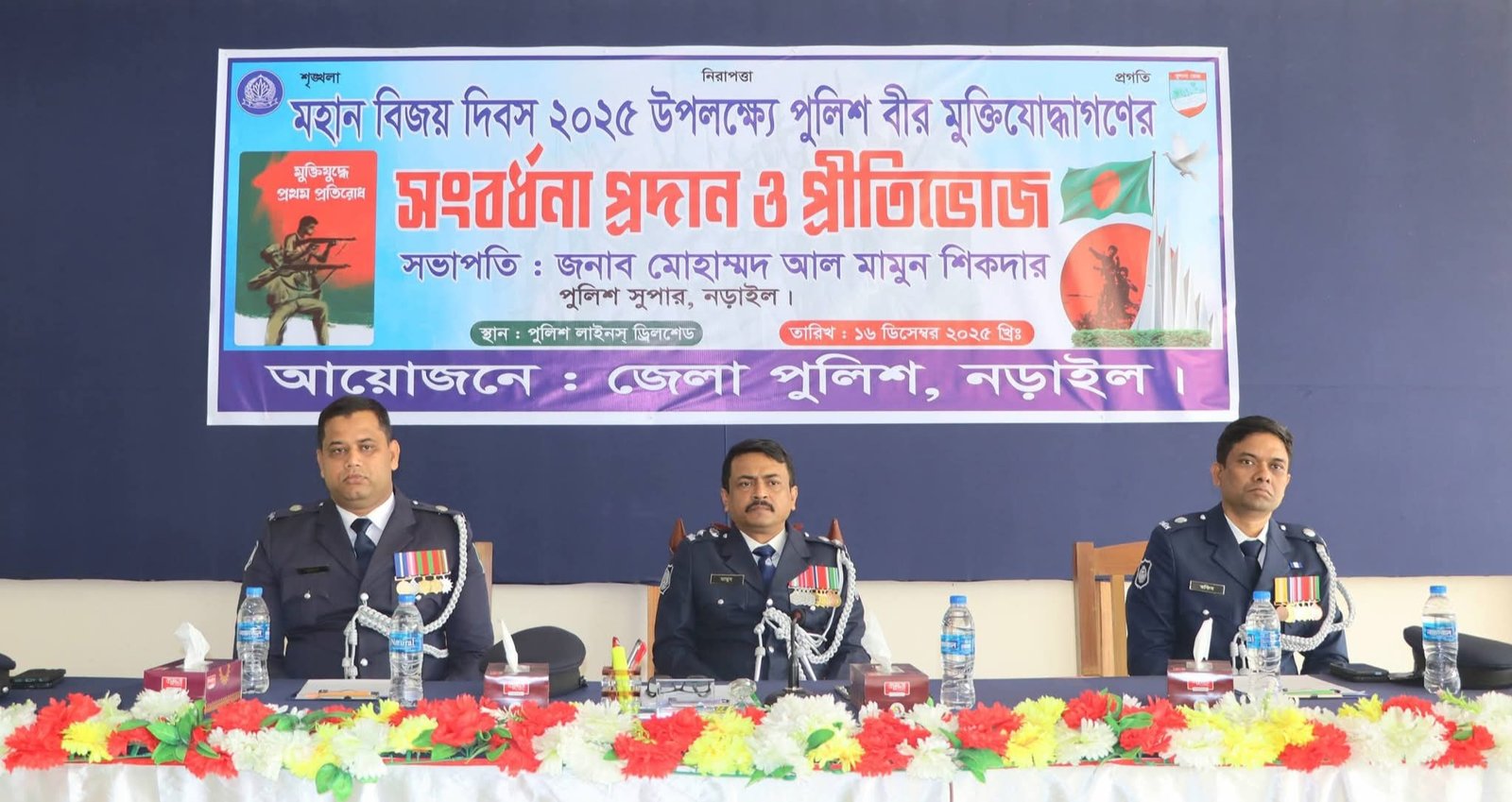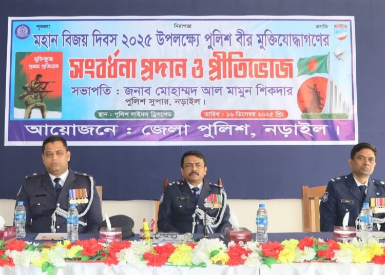 নড়াইলে বীর পুলিশ মুক্তিযোদ্ধাদের সম্মাননা প্রদান করলেন এসপি আল মামুন শিকদার। পুলিশ লাইনস্ ড্রিল শেডে মহান বিজয় দিবস ২০২৫ উপলক্ষ্যে পুলিশ বীর মুক্তিযোদ্ধাদের সম্মাননা প্রদান ও প্রীতিভোজ অনুষ্ঠানের আয়োজন করেন নড়াইল জেলা পুলিশ সুপার মোহাম্মদ আল মামুন শিকদার।