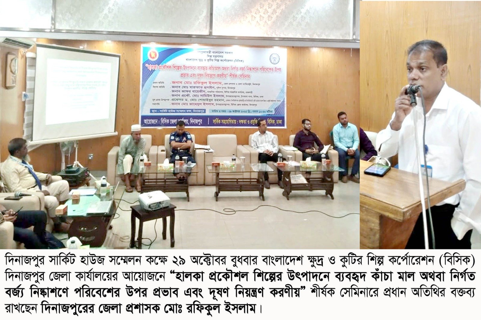 বুধবার (২৯ অক্টোবর) দিনাজপুর সার্কিট হাউজ সম্মেলন কক্ষে বাংলাদেশ ক্ষুদ্র ও কুটির শিল্প কর্পোরেশন (বিসিক) জেলা কার্যালয়ের আয়োজনে “হালকা প্রকৌশল শিল্পের উৎপাদনে ব্যবহৃত কাঁচামাল অথবা নির্গত বর্জ্য নিষ্কাশনে পরিবেশের উপর প্রভাব ও দূষণ নিয়ন্ত্রণ করণীয়” শীর্ষক সেমিনার অনুষ্ঠিত হয়।