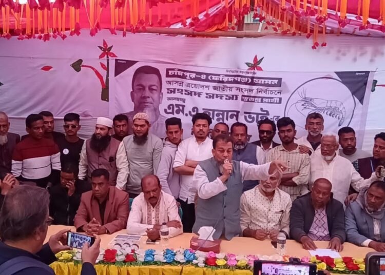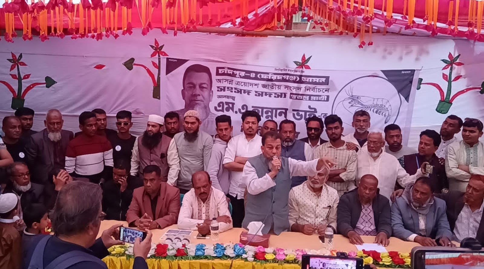 চাঁদপুরের ফরিদগঞ্জ উপজেলার গুপ্টি পশ্চিম ইউনিয়নে চিংড়ি প্রতীকের সমর্থনে জনসভার সময় স্বতন্ত্র প্রার্থী আলহাজ্ব এম এ হান্নান জনগণের কাছে ভোটের মাধ্যমে অধিকার বাস্তবায়নের আহ্বান জানান।