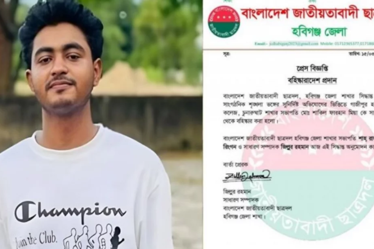 হবিগঞ্জের চুনারুঘাটে মুরগি ছিনতাইয়ের অভিযোগে স্থানীয় ছাত্রদলের এক নেতা মো. শাকিল ফারহান মিয়াকে সংগঠনের পদ থেকে বহিষ্কার করা হয়েছে। তিনি গাজীপুর হাই স্কুল অ্যান্ড কলেজ ছাত্রদলের সভাপতি ছিলেন।