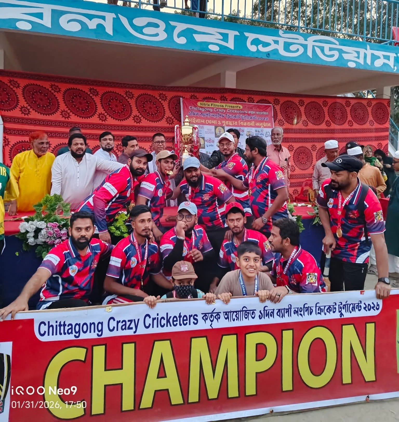 গতকাল শনিবার, ৩১ জানুয়ারি বিকাল ৩ টায় চট্টগ্রাম নগরীর পলোগ্রাউন্ড স্টেডিয়াম মাঠে চিটাগাং ক্রেজি ক্রিকেটারস এর উদ্যোগে দিনব্যাপী লং পিচ ক্রিকেট টুর্নামেন্ট ২০২৬ অনুষ্ঠিত হয়। ম্যাচে মরহুম আবদুল মোতালেব স্মৃতি সংসদ চ্যাম্পিয়ন হওয়ার গৌরব অর্জন করেন। রার্নাস আপ হয়েছেন শাহ মোহছেন আউলিয়া স্মৃতি সংসদ এবং ৩য স্থান হযেছেন মরহুম বেগম খালেদা জিয়া স্মৃতি সংসদ।