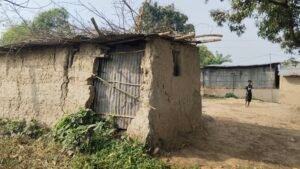 চারদিকে সবুজ ফসলের মাঠ, পাশে ছোট দুটি পুকুর আর সামনে কয়েকটি বসতঘর—প্রকৃতির শান্ত পরিবেশের মাঝেই পুকুরপাড়ে দাঁড়িয়ে আছে একটি ভাঙাচোরা ঘর। মাটির চার দেয়াল, ভাঙা টিনে ঘেরা, উপরে ঢেউটিনের ছাউনি—যা আবার চাপা দেওয়া হয়েছে গাছের ডাল দিয়ে। দূর থেকে দেখলে মনে হয় পাখির বাসা, কাছে গেলে বোঝা যায়—এটাই মানুষের বসবাসের জায়গা।