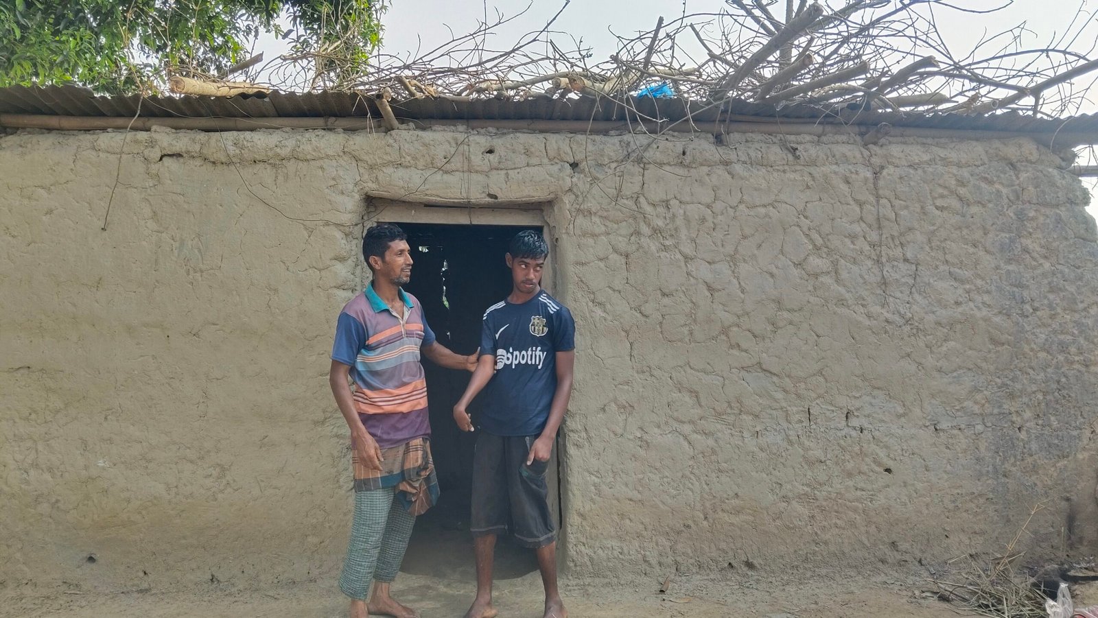 চারদিকে সবুজ ফসলের মাঠ, পাশে ছোট দুটি পুকুর আর সামনে কয়েকটি বসতঘর—প্রকৃতির শান্ত পরিবেশের মাঝেই পুকুরপাড়ে দাঁড়িয়ে আছে একটি ভাঙাচোরা ঘর। মাটির চার দেয়াল, ভাঙা টিনে ঘেরা, উপরে ঢেউটিনের ছাউনি—যা আবার চাপা দেওয়া হয়েছে গাছের ডাল দিয়ে। দূর থেকে দেখলে মনে হয় পাখির বাসা, কাছে গেলে বোঝা যায়—এটাই মানুষের বসবাসের জায়গা।