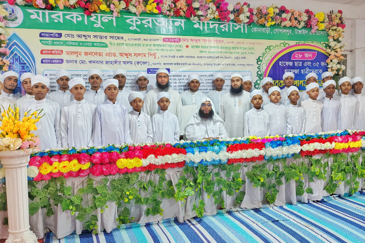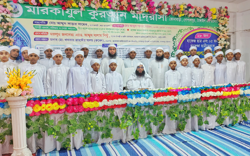 গোপালপুরের মারকাজুল কুরআন মাদ্রাসা রবিবার সন্ধ্যায় ২৮ জন হাফেজ ছাত্রকে বরকতি পাগড়ি এবং ৫ জন হাফেজা ছাত্রীকে হিজাব প্রদান করে। অনুষ্ঠানে শিক্ষার্থীদের জন্য দোয়া, নসিয়ত ও ভবিষ্যৎ সাফল্যের আশীর্বাদ প্রদান করা হয়।