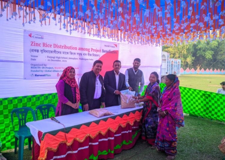 ২ ডিসেম্বর মঙ্গলবার বেলা ২.৩০ঘটিকায় গ্লোবাল অ্যাফেয়ার্স কানাডা(GAC) এ অর্থায়নে আন্তর্জাতিক উন্নয়ন সংস্থা ওয়ার্ল্ড ভিশন বাংলাদেশের ঠাকুরগাঁও রিঅ্যাক্টস ইন প্রকল্পের সহযোগিতায় জিংক সমৃদ্ধ ধানের বীজ বিধ্রান১০২ এবং বিধ্রান৭৪ ঠাকুরগাঁও সদর উপজেলার জামালপুর ইউনিয়নের পারপূগি উচ্চ মাধ্যমিক বিদ্যালয় ১৭৩ জন নারী কৃষকদের মাঝে এবং বড়গাঁও ইউনিয়নের লক্ষীরহাট উচ্চ মাধ্যমিক বিদ্যালয়ে ৩৬০জন নারী কৃষককে বিনামূল্যে জিং ধানের বীজ বিতরণ করা হয়েছে। মঙ্গলবার (২ডিসেম্বর) দুপুরে ঠাকুরগাঁও কৃষি অফিসের সহযোগিতায় ও ওয়ার্ল্ড ভিশন বাংলাদেশ ঠাকুরগাঁয়ের রিঅ্যাক্টস ইন প্রকল্পের আয়োজনে উক্ত জিং ধানের বীজ প্রদান করা হয়