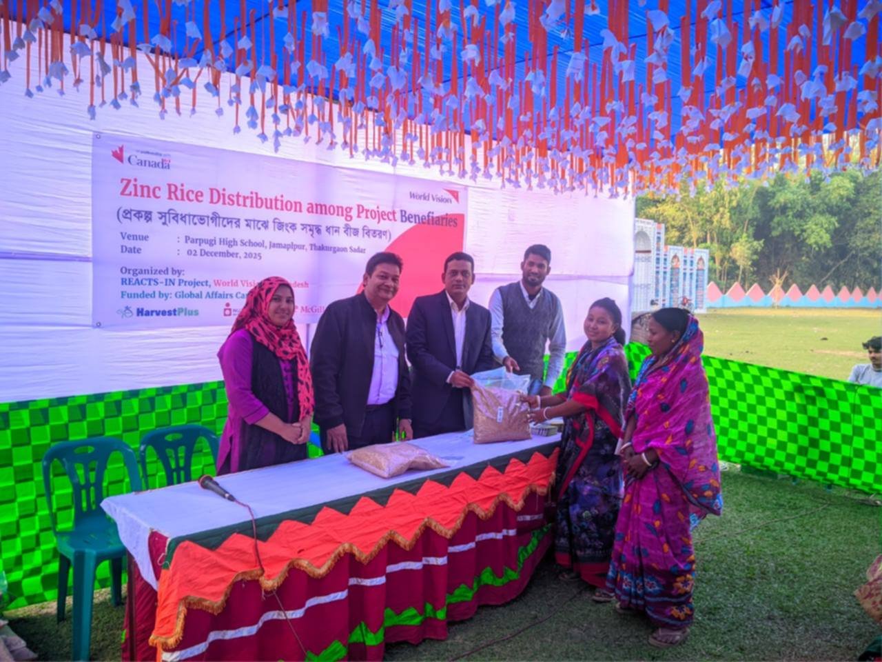 ২ ডিসেম্বর মঙ্গলবার বেলা ২.৩০ঘটিকায় গ্লোবাল অ্যাফেয়ার্স কানাডা(GAC) এ অর্থায়নে আন্তর্জাতিক উন্নয়ন সংস্থা ওয়ার্ল্ড ভিশন বাংলাদেশের ঠাকুরগাঁও রিঅ্যাক্টস ইন প্রকল্পের সহযোগিতায় জিংক সমৃদ্ধ ধানের বীজ বিধ্রান১০২ এবং বিধ্রান৭৪ ঠাকুরগাঁও সদর উপজেলার জামালপুর ইউনিয়নের পারপূগি উচ্চ মাধ্যমিক বিদ্যালয় ১৭৩ জন নারী কৃষকদের মাঝে এবং বড়গাঁও ইউনিয়নের লক্ষীরহাট উচ্চ মাধ্যমিক বিদ্যালয়ে ৩৬০জন নারী কৃষককে বিনামূল্যে জিং ধানের বীজ বিতরণ করা হয়েছে। মঙ্গলবার (২ডিসেম্বর) দুপুরে ঠাকুরগাঁও কৃষি অফিসের সহযোগিতায় ও ওয়ার্ল্ড ভিশন বাংলাদেশ ঠাকুরগাঁয়ের রিঅ্যাক্টস ইন প্রকল্পের আয়োজনে উক্ত জিং ধানের বীজ প্রদান করা হয়