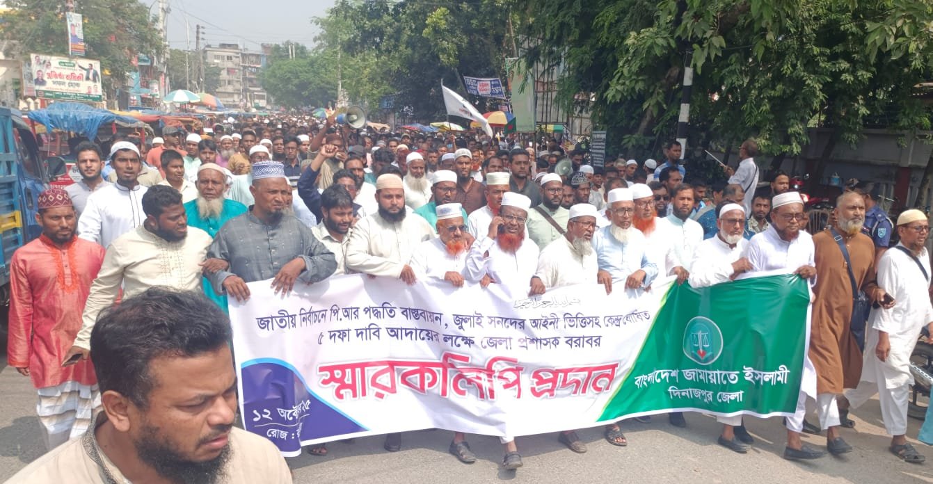 রবিবার (১২ অক্টোবর ২০২৫) দুপুরে ধারাবাহিক আন্দোলনের অংশ হিসেবে দিনাজপুর ইনস্টিটিউট মাঠ থেকে এক বর্ণাঢ্য মিছিল বের করে জামায়াতে ইসলামী।