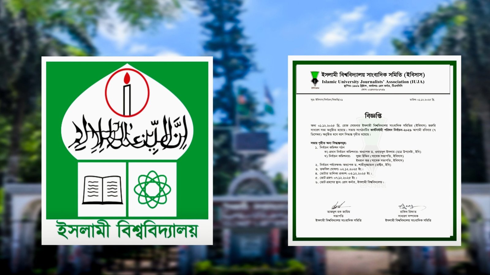 ইসলামী বিশ্ববিদ্যালয়ের (ইবি) সর্বপ্রথম প্রতিষ্ঠিত সাংবাদিক সংগঠন ইসলামী বিশ্ববিদ্যালয় সাংবাদিক সমিতি (ইবিসাস) এর কার্যনির্বাহী পরিষদ নির্বাচন-২০২৬ আগামী রবিবার (৭ ডিসেম্বর) অনুষ্ঠিত হবে। সোমবার (০১ ডিসেম্বর) সংগঠনটির সভাপতি তাজমুল হক জায়িম ও সাধারণ সম্পাদক রাকিব রিফাত স্বাক্ষরিত এক বিজ্ঞপ্তিতে এ তথ্য জানানো হয়েছে।