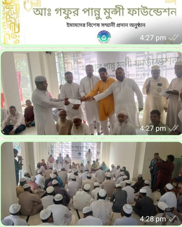 আব্দুল গফুর মুন্সী জামে মসজিদে ইমামদের নগদর অর্থ বিতরণ উপলক্ষে সংক্ষিপ্ত বক্তব্য রাখেন, মুফতি সালাউদ্দিন আহমেদ, মুফতি ওবায়দুর রহমান ,আব্দুর রাজ্জাক মাস্টার, সম্ভাব্য উপজেলা পরিষদের চেয়ারম্যান পদপ্রার্থী মোহাম্মদ মোস্তফা কবির। সভাটি পরিচালনা করেন ফরিদ মাস্টার, সহযোগিতা করেন আজাদ হোসেন।