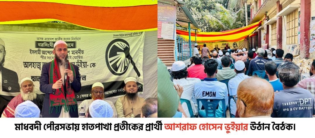 নরসিংদী-১ (সদর–মাধবদী) আসনে মাধবদী পৌরসভার ১১নং ওয়ার্ড শাখার উদ্যোগে হাতপাখা প্রতীকের সংসদ সদস্য পদপ্রার্থী আলহাজ্ব আশরাফ হোসেন ভূঁইয়ার নির্বাচনী উঠান বৈঠক অনুষ্ঠিত হয়েছে।