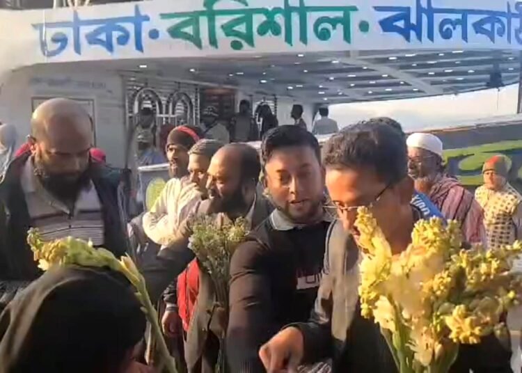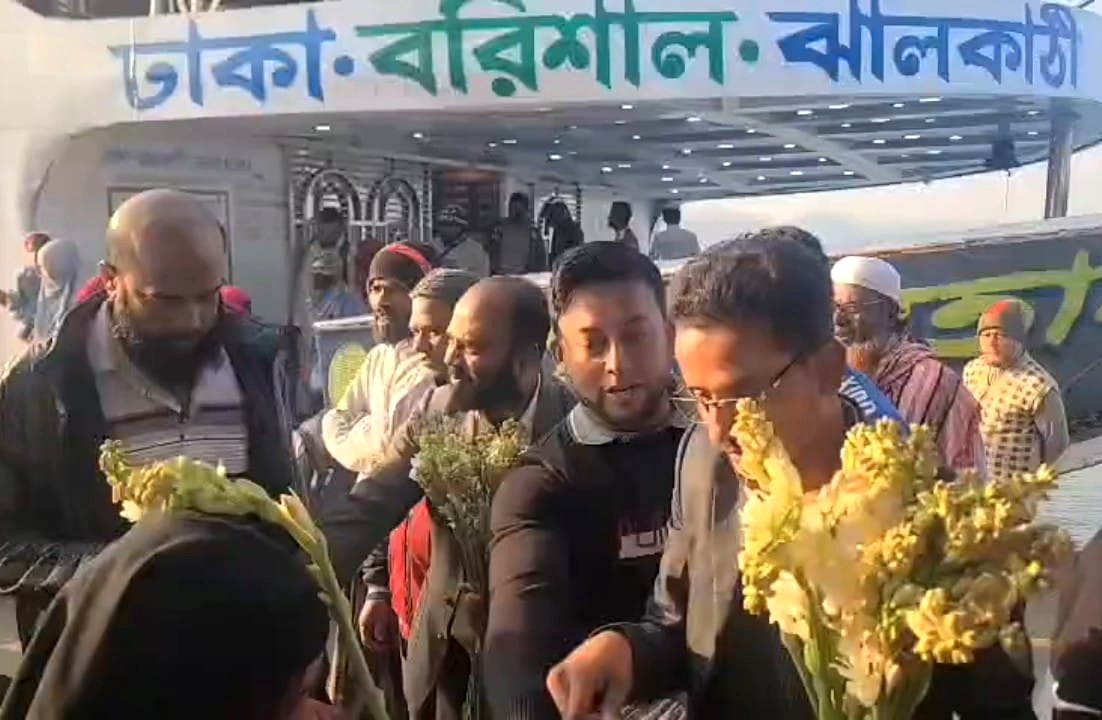 ঝালকাঠিতে ঢাকা থেকে লঞ্চযোগে আসা যাত্রীদের রজনী গন্ধা ফুল দিয়ে শুভেচ্ছা জানানোর মাধ্যমে ধানের শীষে ভোট চাইলেন ঝালকাঠি জেলা বিএনপির আহবায়ক কমিটির সদস্য (দপ্তরের দায়িত্বে)  অ্যাড. মিজানুর রহমান মুবিন।