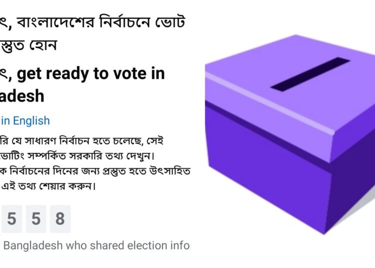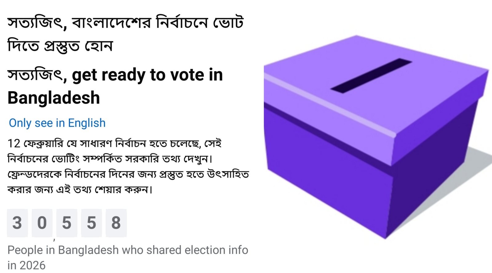 ফেসবুক ব্যবহারকারীদের টাইমলাইনে ভেসে উঠেছে একটি বিশেষ নির্বাচন-সংশ্লিষ্ট নোটিফিকেশন কার্ড। নীল-সাদা রঙের এই কার্ডে বড় অক্ষরে লেখা- “Get Ready to Vote in Bangladesh”। এর নিচে উল্লেখ করা হয়েছে, ১২ ফেব্রুয়ারি বাংলাদেশে সাধারণ নির্বাচন অনুষ্ঠিত হবে-এমন তথ্য ঘিরে সামাজিক যোগাযোগমাধ্যমে শুরু হয়েছে নানা আলোচনা ও কৌতূহল।