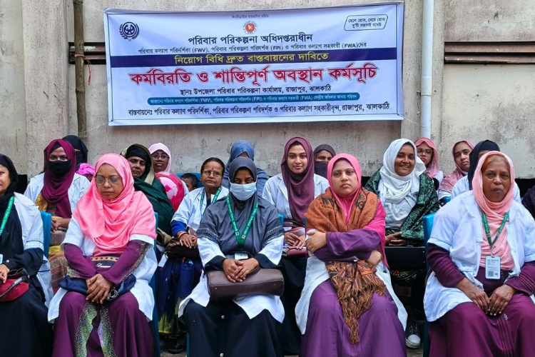 রাজাপুরে নিয়োগবিধির দাবিতে পরিবার পরিকল্পনা অধিদপ্তরের মাঠ কর্মীদের অবস্থান তৃতীয় দিনেও