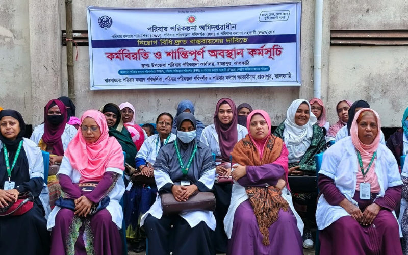 রাজাপুরে নিয়োগবিধির দাবিতে পরিবার পরিকল্পনা অধিদপ্তরের মাঠ কর্মীদের অবস্থান তৃতীয় দিনেও