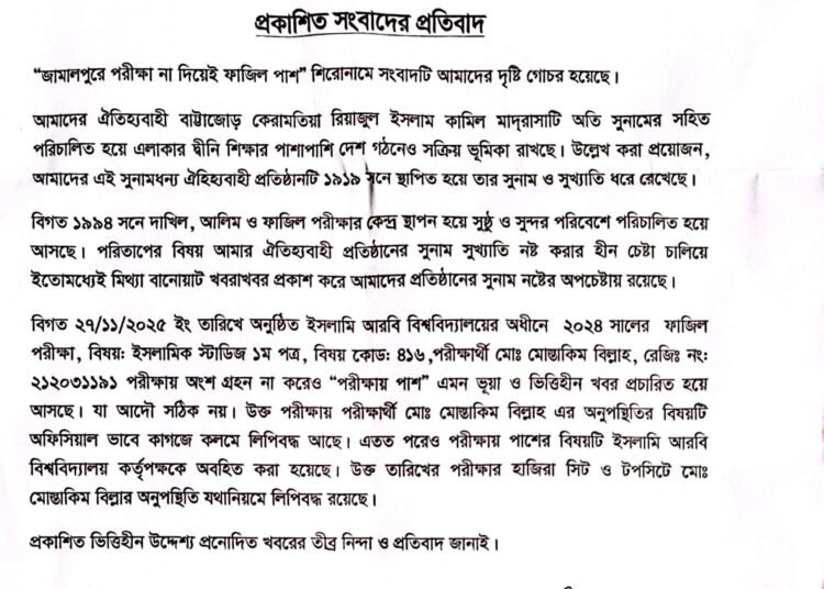 জামালপুর জেলার বকশীগঞ্জ উপজেলার বাট্টাজোড় কেরামতিয়া রিয়াজুল ইসলাম কামিল মাদরাসার মোস্তাকিম বিল্লাহ নামে এক শিক্ষার্থী ইসলামি স্টাডিজ বিষয়ে ফাজিল পরীক্ষা না দিয়েই ফাজিল পাশ করেছে। পরীক্ষা চলাকালিন পরীক্ষার্থী মোস্তাকিম বিল্লাহ সৌদি আরবে অবস্থান করছিলেন। তার পরেও তিনি জিপিএ-৩.২৫ পেয়ে পাশ করেছেন। যে বিষয়ে পরীক্ষা দেননি সে বিষয়ে তিনি বি গ্রেড পেয়েছেন।