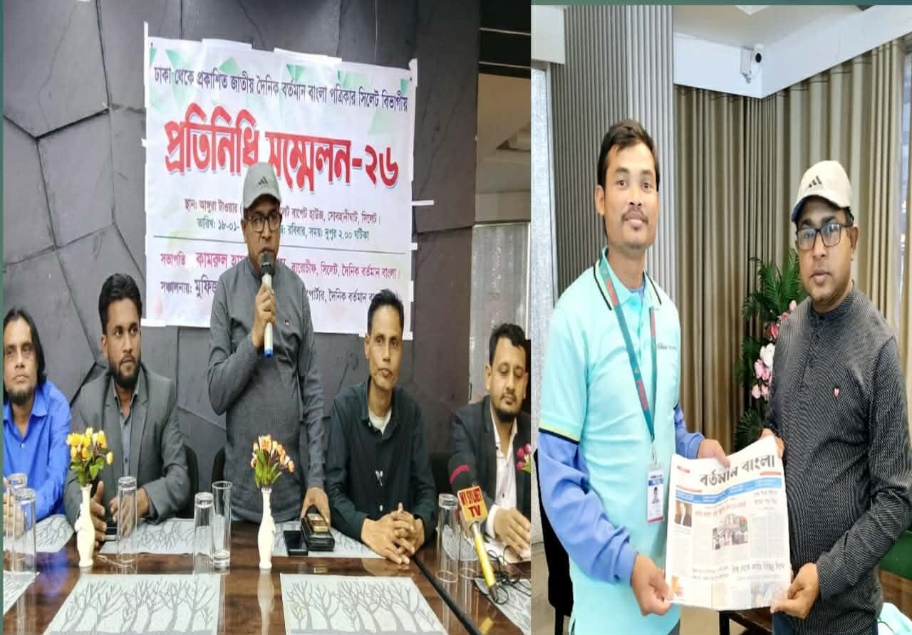 রোববার (১৮ জানুয়ারি ২০২৬) বিকাল ৩টায় সিলেট নগরীর সোবহানীঘাটস্থ আঙ্গুরা টাওয়ারের দি সিলেট বাপেট হাউজে অনুষ্ঠিত সম্মেলনে প্রধান অতিথির বক্তব্যে দৈনিক বর্তমান বাংলার পাঁচটি বিভাগের দায়িত্বপ্রাপ্ত কর্মকর্তা ও মফস্বল ইনচার্জ সিরাজুল মনির বলেন, “মাঠপর্যায়ের প্রতিনিধিরাই একটি পত্রিকার প্রাণ। বস্তুনিষ্ঠ সংবাদ, অনুসন্ধানী প্রতিবেদন ও নৈতিক সাংবাদিকতার মাধ্যমে বর্তমান বাংলাকে দেশব্যাপী আরও শক্ত অবস্থানে নিতে হবে।”