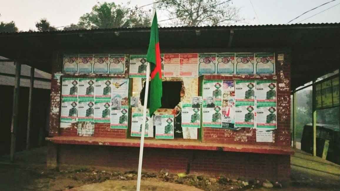 স্থানীয় সূত্রে জানা যায়, মঙ্গলবার দিবাগত রাতে কে বা কারা শেখ মুজিবর রহমান ও সাবেক প্রধানমন্ত্রী শেখ হাসিনার কয়েকটি লিফলেট জাতীয় ছবি টাঙিয়ে জাতীয় পতাকা উত্তোলন করেন। বুধবার সকালে বিষয়টি জানাজানি হলে পরে দেয়ালে লাগানো ছবি ও পতাকা খুলে ফেলা হয়।
