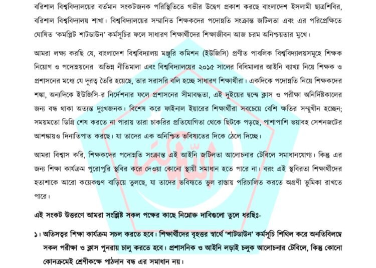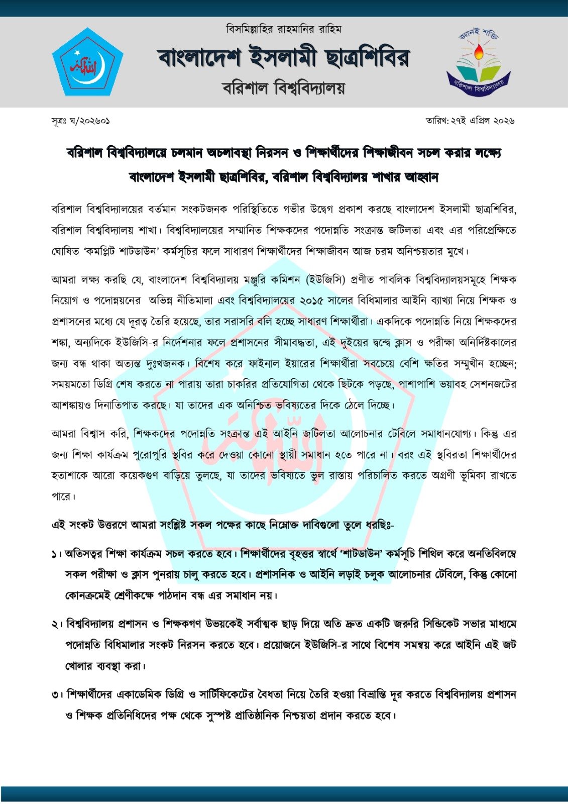 বিজ্ঞপ্তিতে বলা হয়েছে, বিশ্ববিদ্যালয়ের শিক্ষকদের পদোন্নতি সংক্রান্ত জটিলতা এবং এর পরিপ্রেক্ষিতে ঘোষিত ‘কমপ্লিট শাটডাউন’ কর্মসূচির ফলে সাধারণ শিক্ষার্থীদের শিক্ষাজীবন আজ চরম অনিশ্চয়তার মুখে। আমরা লক্ষ্য করছি যে, বাংলাদেশ বিশ্ববিদ্যালয় মঞ্জুরি কমিশন (ইউজিসি) প্রণীত পাবলিক বিশ্ববিদ্যালয়সমূহে শিক্ষক নিয়োগ ও পদোন্নয়নের অভিন্ন নীতিমালা এবং বিশ্ববিদ্যালয়ের ২০১৫ সালের বিধিমালার আইনি ব্যাখ্যা নিয়ে শিক্ষক ও প্রশাসনের মধ্যে যে দূরত্ব তৈরি হয়েছে, তার সরাসরি বলি হচ্ছে সাধারণ শিক্ষার্থীরা।