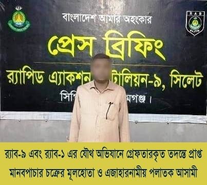 র‍্যাব-৯ ও র‍্যাব-১ এর যৌথ অভিযানে সুনামগঞ্জে ইউরোপে কর্মী পাঠানোর নামে প্রতারণার ঘটনায় এক পলাতক আসামিকে নারায়ণগঞ্জ থেকে গ্রেফতার করা হয়েছে।