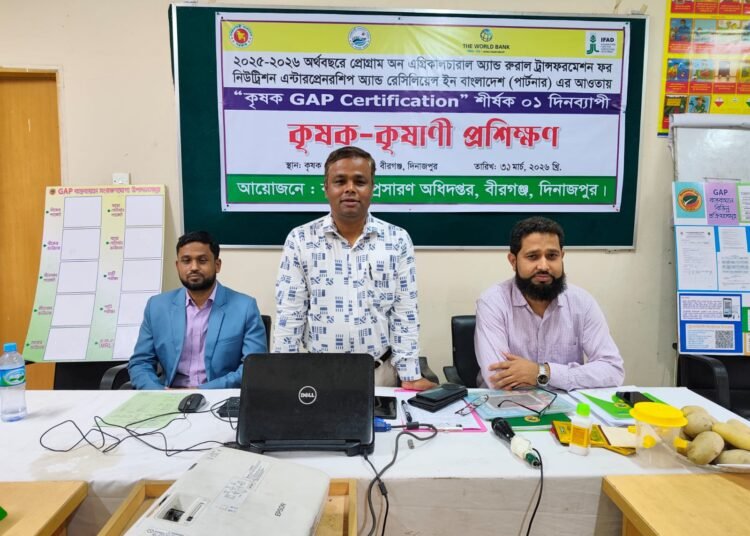 নিরাপদ খাদ্য উৎপাদন ও টেকসই কৃষি ব্যবস্থাপনা নিশ্চিত করতে দিনাজপুরের বীরগঞ্জে কৃষকদের জন্য “ উত্তম কৃষি চর্চা সার্টিফিকেশন” শীর্ষক দিনব্যাপী প্রশিক্ষণ অনুষ্ঠিত হয়েছে।