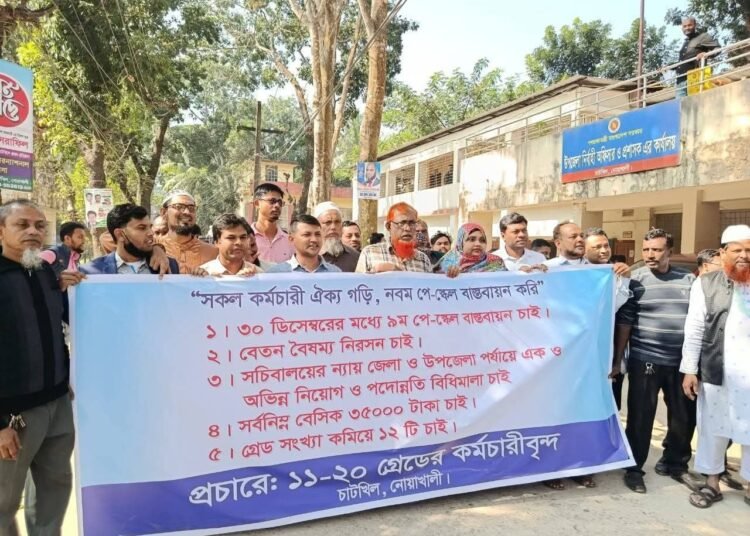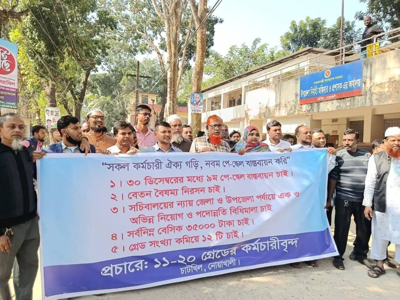 নোয়াখালী জেলার চাটখিল উপজেলার ৪ ডিসেম্বর (বৃহস্পতিবার) দুপুরে সরকারি কর্মচারীরা উপজেলা পরিষদ প্রাঙ্গনে মানববন্ধন করেন। মানববন্ধন শেষে তারা চাটখিল উপজেলা নির্বাহী কর্মকর্তা মিজানুর রহমানের কাছে স্মারকলিপি প্রদান করেন।