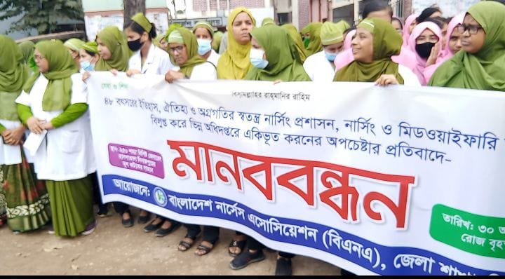 দিনাজপুরে নার্সিং ও মিডওয়াইফারি অধিদপ্তরকে বিলুপ্ত করে ভিন্ন অধিদপ্তরে একীভূত করার প্রস্তাবের প্রতিবাদে মানববন্ধন কর্মসূচি পালন করেছে বাংলাদেশ নার্সেস এসোসিয়েশন (বিএনএ), দিনাজপুর জেলা শাখা।