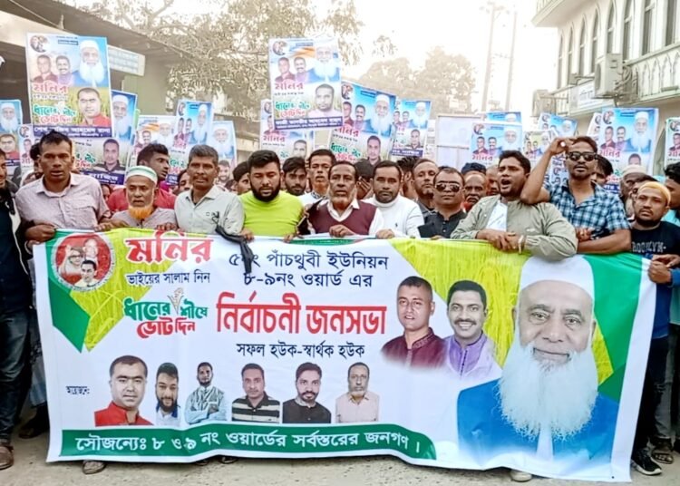 বৃহস্পতিবার (৫ ফেব্রুয়ারি) বিকেলে পাঁচথুবী ইউনিয়নের চাঁনপুর এলাকা থেকে র্যালিটি শুরু হয়ে ইউনিয়নের বিভিন্ন গুরুত্বপূর্ণ সড়ক প্রদক্ষিণ করে চাঁনপুর স্টিল ব্রিজে অনুষ্ঠিত মনিরুল হক চৌধুরীর নির্বাচনী জনসভায় গিয়ে শেষ হয়। র্যালিটির নেতৃত্ব দেন পাঁচথুবী ইউনিয়নের ভারপ্রাপ্ত চেয়ারম্যান কাজী তানভীর আহাম্মেদ রাহুল।