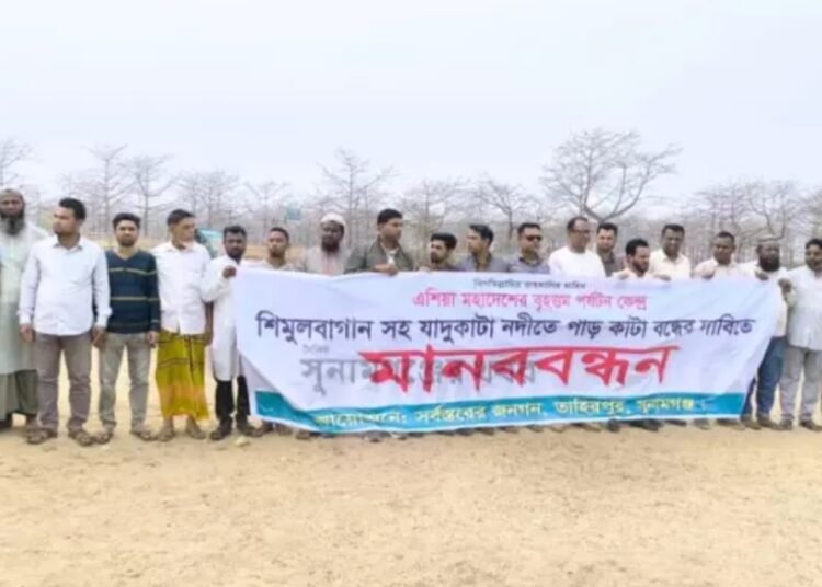 সুনামগঞ্জের তাহিরপুর উপজেলার পর্যটন কেন্দ্র শিমুল বাগান রক্ষা এবং যাদুকাটা নদীর তীর কেটে অবৈধভাবে বালু লুট বন্ধের দাবিতে উত্তাল হয়ে উঠেছে স্থানীয় জনপদ। গত বৃহস্পতিবার দুপুরে শিমুল বাগান সংলগ্ন যাদুকাটা নদীর পাড়ে আয়োজিত এক বিশাল মানববন্ধনে এলাকার সাধারণ মানুষ এবং পরিবেশপ্রেমীরা স্বতঃস্ফূর্তভাবে অংশ নেন। মানববন্ধনে বিভিন্ন সামাজিক সংগঠনের নেতৃবৃন্দ ছাড়াও বিএনপির স্থানীয় নেতা কর্মীরা উপস্থিত ছিলেন।