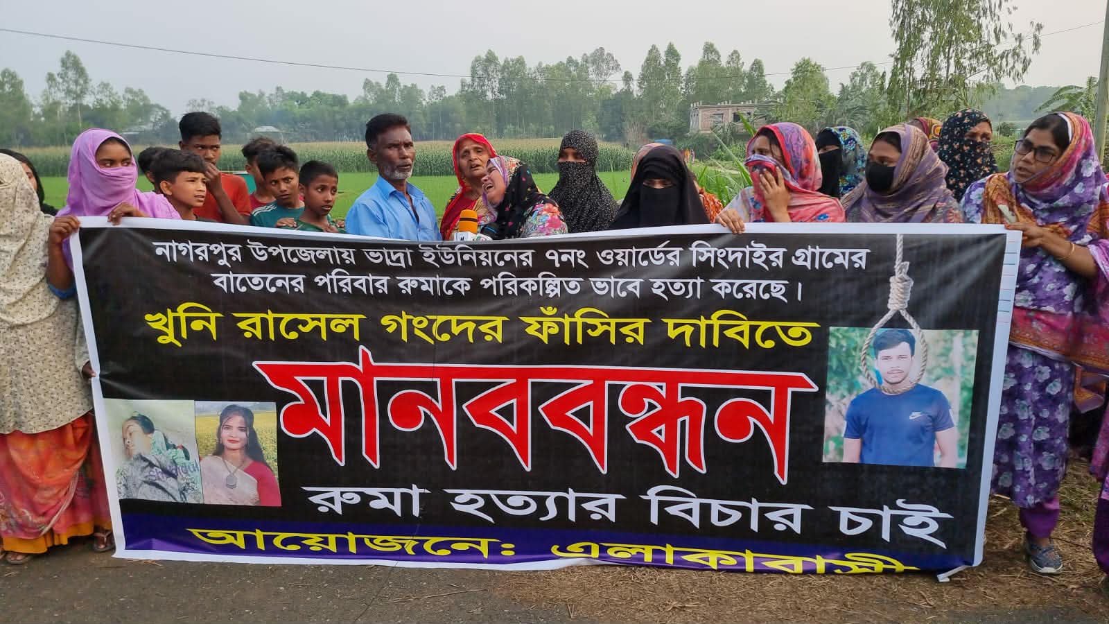 টাঙ্গাইলে রুমা হত্যার অভিযোগে স্বামী রাসেলের ফাঁসির দাবিতে মানববন্ধন