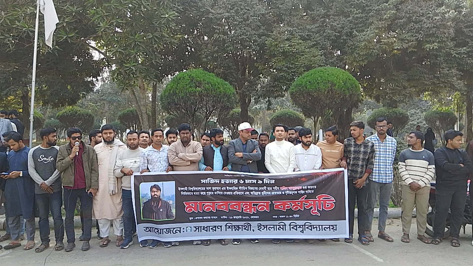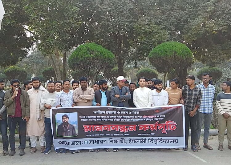 ইসলামী বিশ্ববিদ্যালয়ের (ইবি) আল-কুরআন অ্যান্ড ইসলামিক স্টাডিজ বিভাগের শিক্ষার্থী সজিদ আব্দুল্লাহ হত্যার বিচার দাবিতে মানববন্ধন করেছে শিক্ষার্থীরা। সোমবার (২৬ জানুয়ারি) দুপুর ১টায় বিশ্ববিদ্যালয়ের প্রশাসন ভবন চত্বরে সাধারণ শিক্ষার্থীদের ব্যানারে এ মানববন্ধন অনুষ্ঠিত হয়।